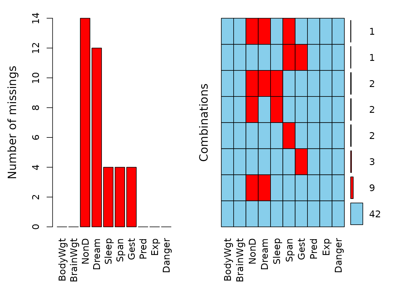 The left plot shows the amount of missings for each column in the dataset sleep and the right plot shows how often each combination of missings occur. For example, there are 9 rows wich contain a missing in both NonD and Dream.