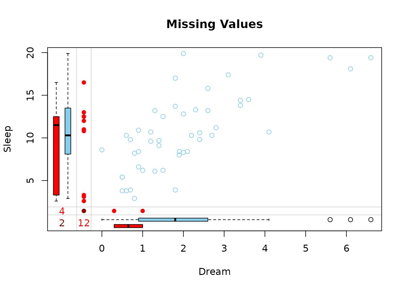 The red boxplot on the left shows the distrubution of all values of Sleep where Dream contains a missing value. The blue boxplot on the left shows the distribution of the values of Sleep where Dream is observed.