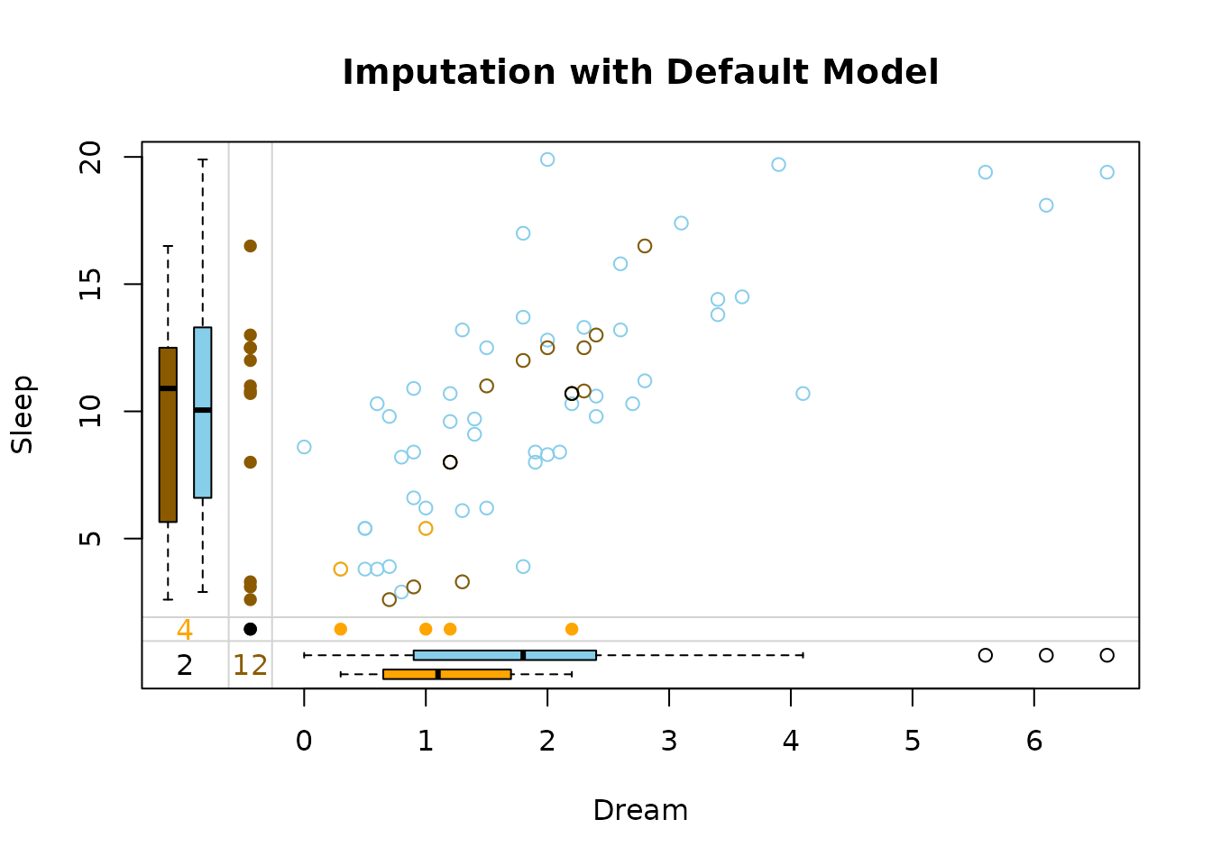 marginplot(dataDS, delimiter = "_imp", main = "Imputation with Default Model")