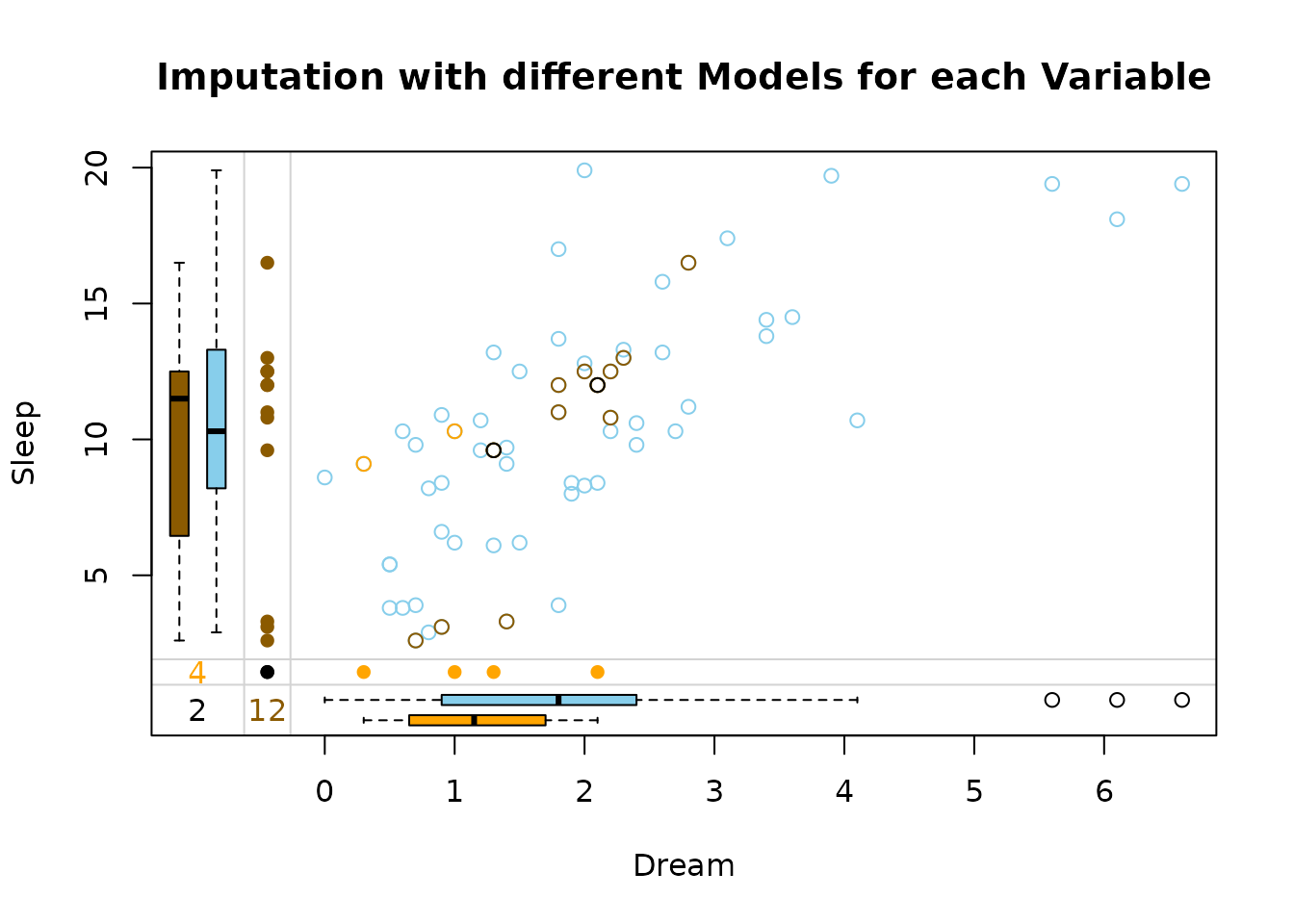 marginplot(dataDS, delimiter = "_imp", main = "Imputation with different Models for each Variable")
